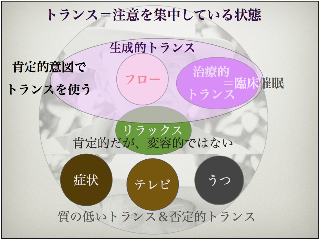 ですから、TVを見て集中しているときは”TVトランス”だし、何かのフローの状態、スポーツをしてゾーンに入っているのも、1つのトランスの状態だと思います。